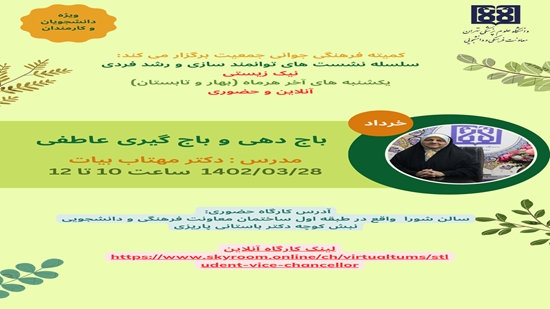 اولین جلسه با عنوان «باج دهی و باج گیری عاطفی» با سخنرانی دکتر مهتاب بیات ریزی یکشنبه 28 خرداد 1402 از ساعت 10 تا 12 بصورت حضوری در سالن شورا واقع در طبقه اول ساختمان معاونت فرهنگی و دانشجویی نبش کوچه دکتر باستانی پاریزی و بصورت مجازی از طریق اسکای روم به آدرس اینجا برگزار خواهد شد.