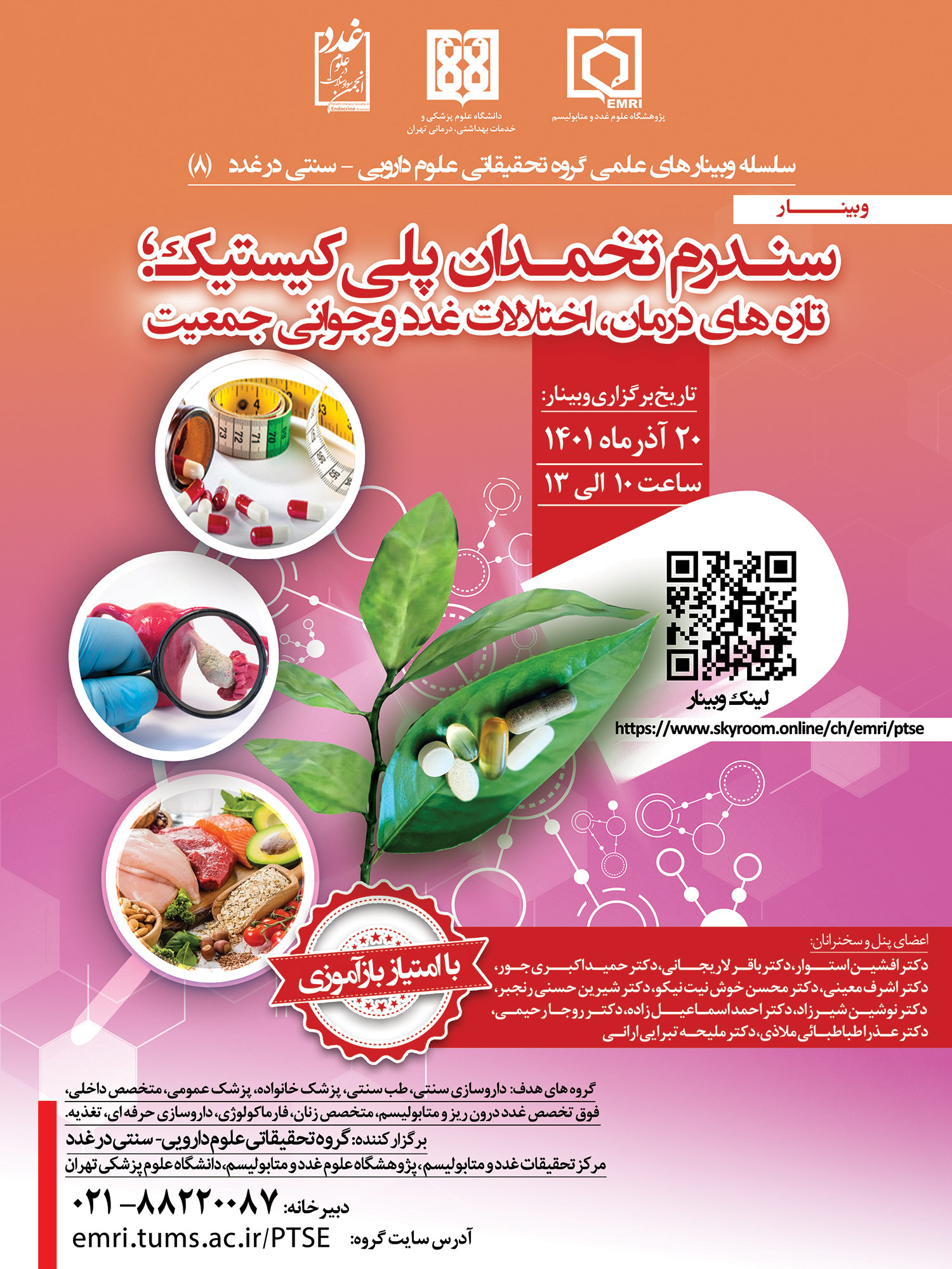 در ادامه سلسله کارگاه های علمی-آموزشی گروه تحقیقاتی علوم دارویی-سنتی در غدد، وبینار سندرم تخمدان پلی کیستیک؛ تازه های درمان، اختلالات غدد و جوانی جمعیت، یکشنبه 20 آذر 1401 برگزار شد.