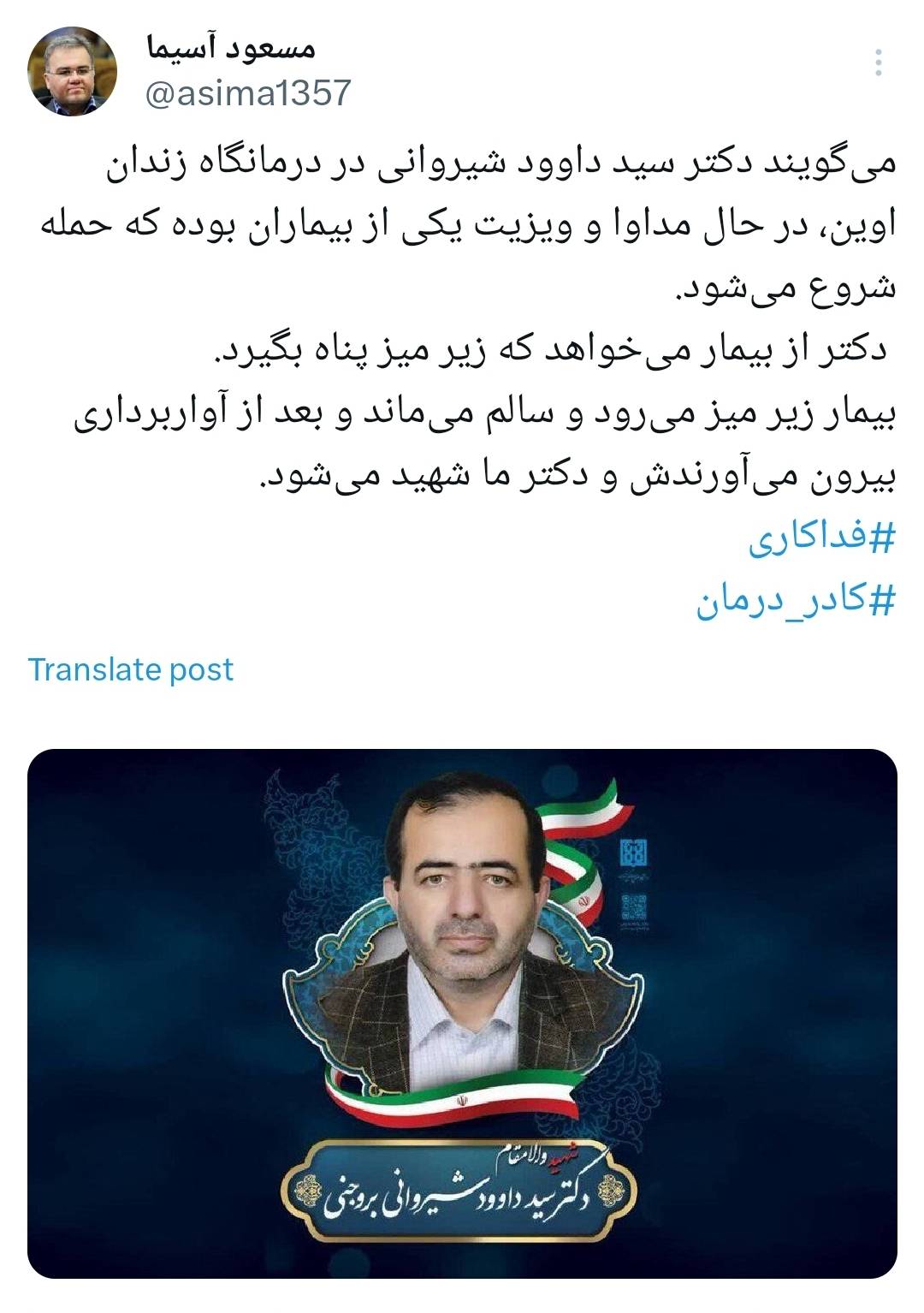 مسعود آسیما، مدیر روابط عمومی دانشگاه علوم پزشکی تهران در شبکه ایکس درخصوص نحوه شهادت دکتر سید داوود شیروانی بروجنی متخصص بیماری‌های عفونی این دانشگاه در پی حمله‌ رژیم صهیونیستی به زندان اوین پست منتشر کرد.