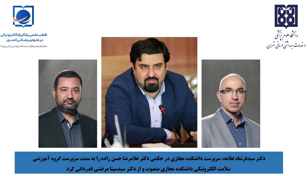 به گزارش روابط عمومی دانشگاه علوم پزشکی تهران دانشکده مجازی، دکتر سیدفرشاد علامه، سرپرست دانشکده مجازی طی حکمی دکتر غلامرضا حسن زاده را به سمت سرپرست گروه آموزشی سلامت الکترونیکی این دانشکده منصوب و در نامه ای از خدمات ارزشمند دکتر سیدسینا مرعشی، مدیر گروه سابق قدردانی کرد.