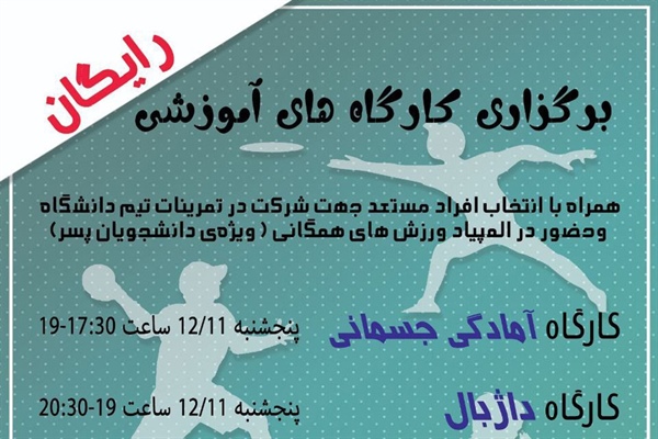 انجمن ورزش های همگانی دانشگاه علوم پزشکی تهران، کارگاه های آموزشی و استعدادیابی آمادگی جسمانی، داژبال و فریزبی را ویژه دانشجویان پسر دانشگاه به صورت رایگان برگزار می کند.