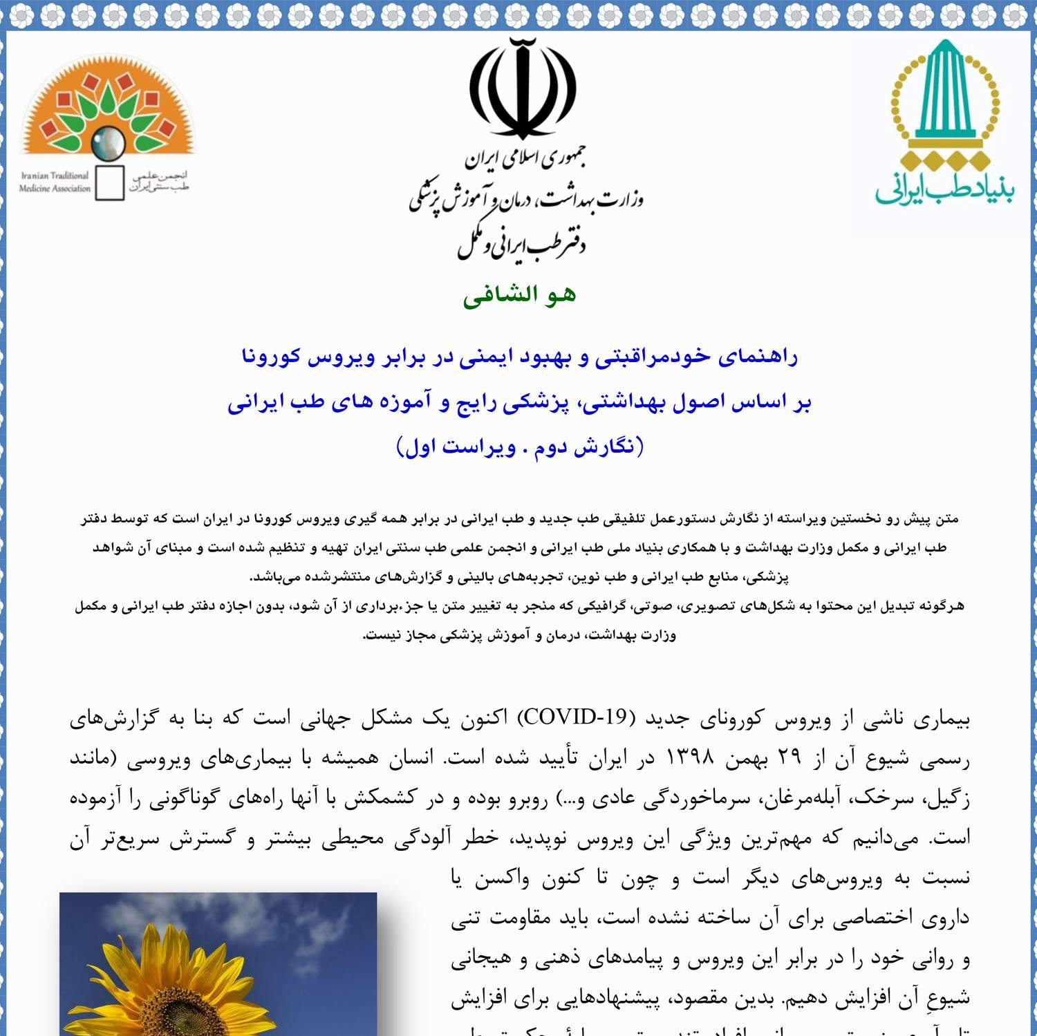 راهنمای خود مراقبتی که به پیوست تقدیم شده، تنها دستور عمل رسمی و مورد تایید دفتر طب ایرانی و مکمل وزارت بهداشت، درمان و آموزش پزشکی است که با همکاری بنیاد ملی طب ایرانی و انجمن علمی طب سنتی ایران تنظیم شده است.