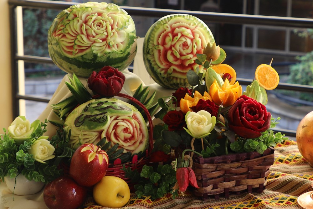 توضیح اینکه، تزئین دستمال سفره، تزئین سبد میوه و حکاکی روی هندوانه (گل رز، گل کوکب و ...) از جمله مواردی است که در این دوره آموزش داده می شود.