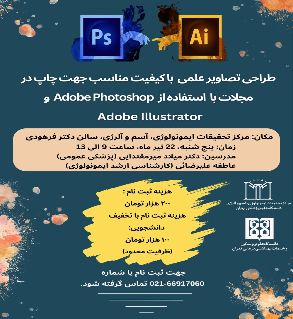 مرکز تحقیقات ایمونولوژی، آسم و آلرژی کارگاه طراحی تصاویر علمی با کیفیت مناسب برای چاپ در مجلات با استفاده از نرم افزارهای Adobe Photoshop و Adobe Illustrator روز پنجشنبه 22 تیر از ساعت 13-9 در سالن دکتر فرهودی مرکز تحقیقات ایمونولوژی، آسم و آلرژی برگزار خواهد کرد.