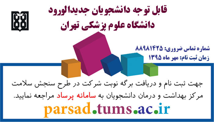 بر اساس این گزارش، شركت در طرح سنجش سلامت براي تمام دانشجويان جديدالورود الزامي است و دانشجویان جدیدالورود می بایست جهت ثبت نام و دريافت برگه نوبت شركت در طرح فوق تا آخر مهرماه به سامانه پرساد http://parsad.tums.ac.ir مراجعه کنند./ق