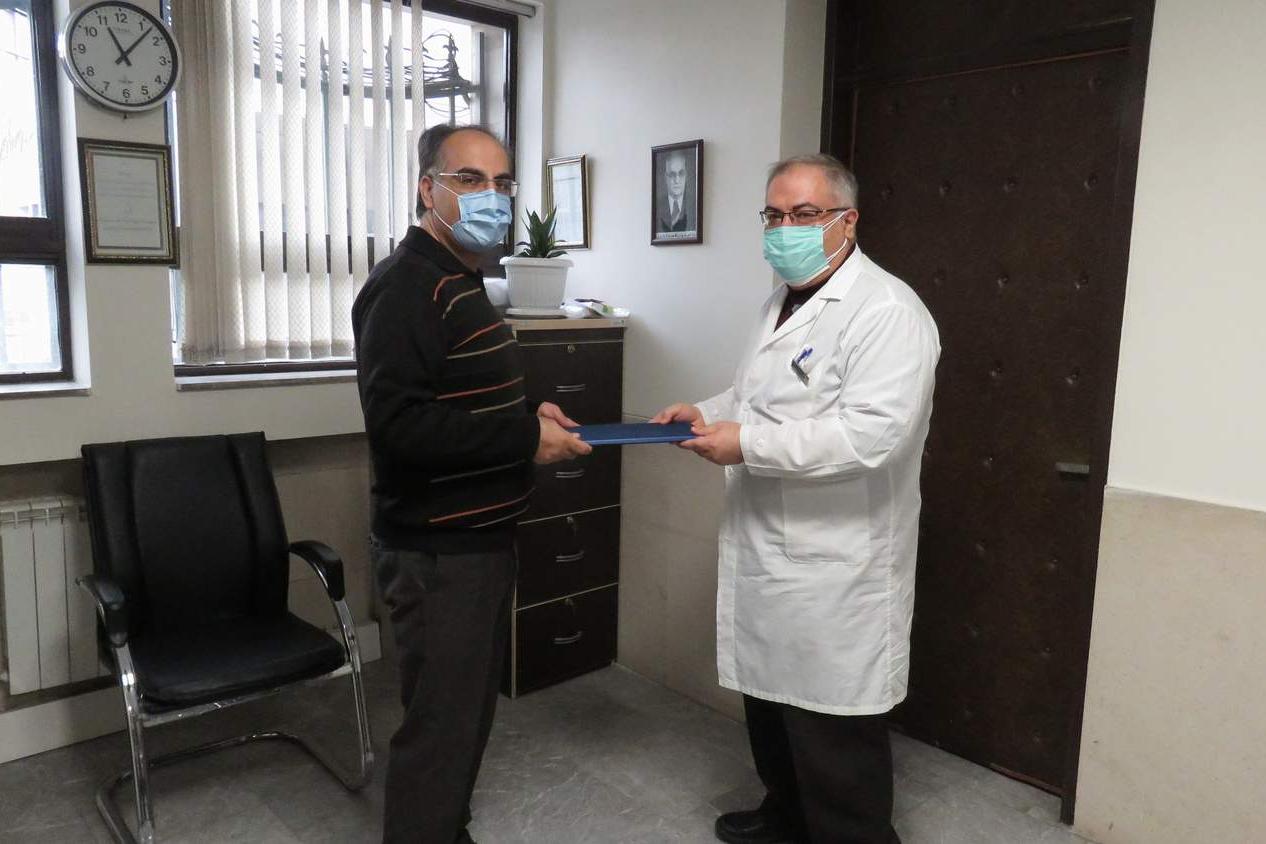 دکتر سید یوسف مجتهدی رئیس بیمارستان کودکان بهرامی از مهندس حسین کامرانی مسئول واحد تجهیزات پزشکی بیمارستان کودکان بهرامی قدردانی کرد.