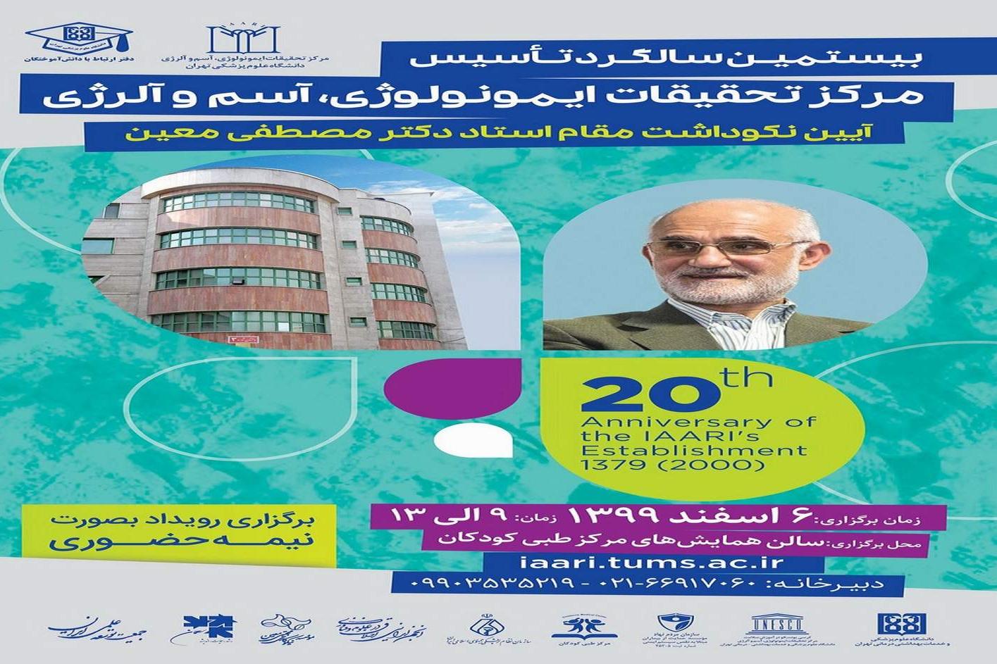 مراسم بیستمین سالگرد تاسیس مرکز تحقیقات ایمونولوژی، آسم و آلرژی و نکوداشت مقام استاد دکتر مصطفی معین روز 6 اسفند در سالن همایش های بیمارستان مرکز طبی کودکان به صورت نیمه حضوری برگزار خواهد شد.