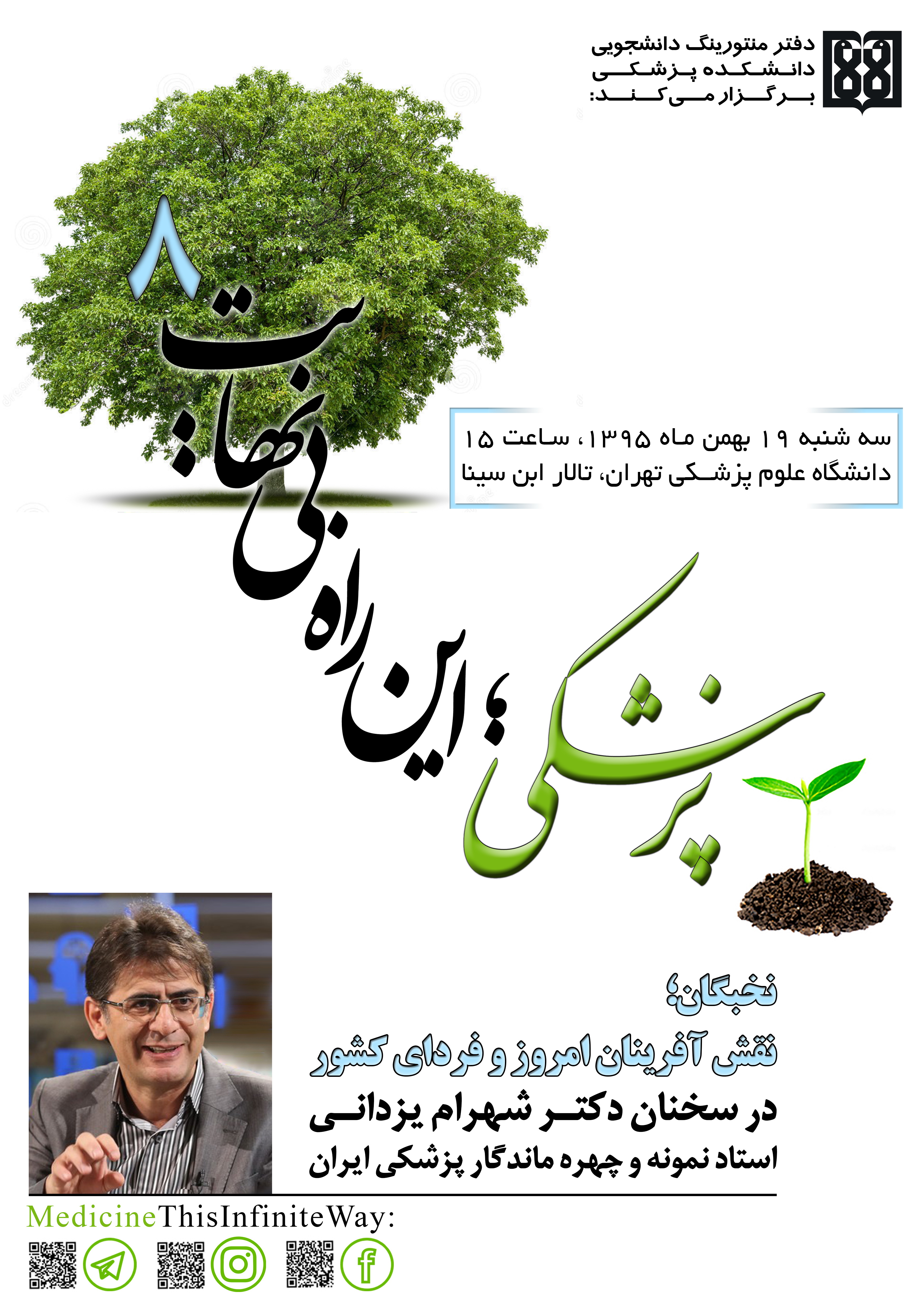 به همت دفتر منتورينگ دانشكده پزشكي، هشتمين همايش پزشكي اين راه بي نهايت با موضوع «نخبگان؛ نقش آفرینان امروز و فردای کشور» و با حضور دکتر شهرام یزدانی، چهره ی ماندگار پزشکی ایران، 19 بهمن در تالار ابن سينا برگزار مي شود.