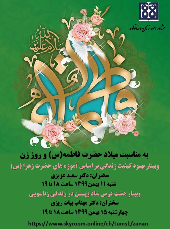 به گزارش روابط عمومی دانشگاه علوم پزشکی تهران دفتر مشاور امور زنان و خانواده، به مناسبت سالروز میلاد حضرت فاطمه زهرا(س) و روز زن دفتر امور زنان در نظر دارد کارگاه آنلاین با عنوان «بهبود کیفیت زندگی بر اساس آموزه های حضرت زهرا(س)» و با تدریس دکتر سعید عزیزی، روان درمانگر و مشاور، روز شنبه 11بهمن 99 از ساعت 18 تا 16 در بستر اسکای روم برگزار کند.