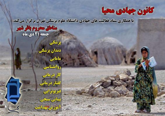 کانون جهادی محیا دانشگاه علوم پزشکی تهران با حمایت مدیریت امور هنری و فوق برنامه و همکاری ستاد فعالیت های جهادی دانشگاه، اردوی جهادی پزشکی را در یکی از مناطق محروم شهر ری برگزار می کند.