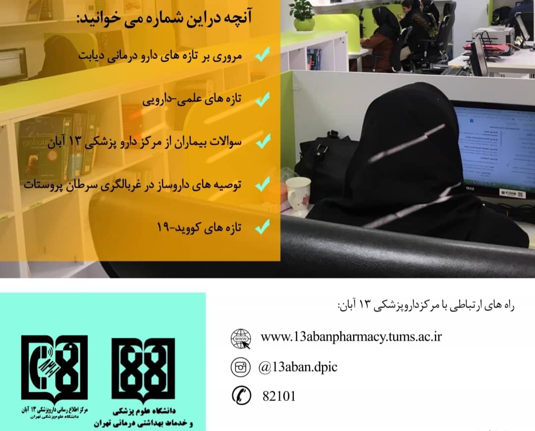 به گزارش روابط عمومی دانشگاه علوم پزشکی تهران، مجموعه داروخانههای دانشگاه (13آبان)، مرکز اطلاع رسانی داروپزشکی 13 آبان، در تاریخ 30 بهمن 1400جدید ترین نسخه خبرنامه اطلاعات داروئی با عناوین زیر را منتشر نمود: