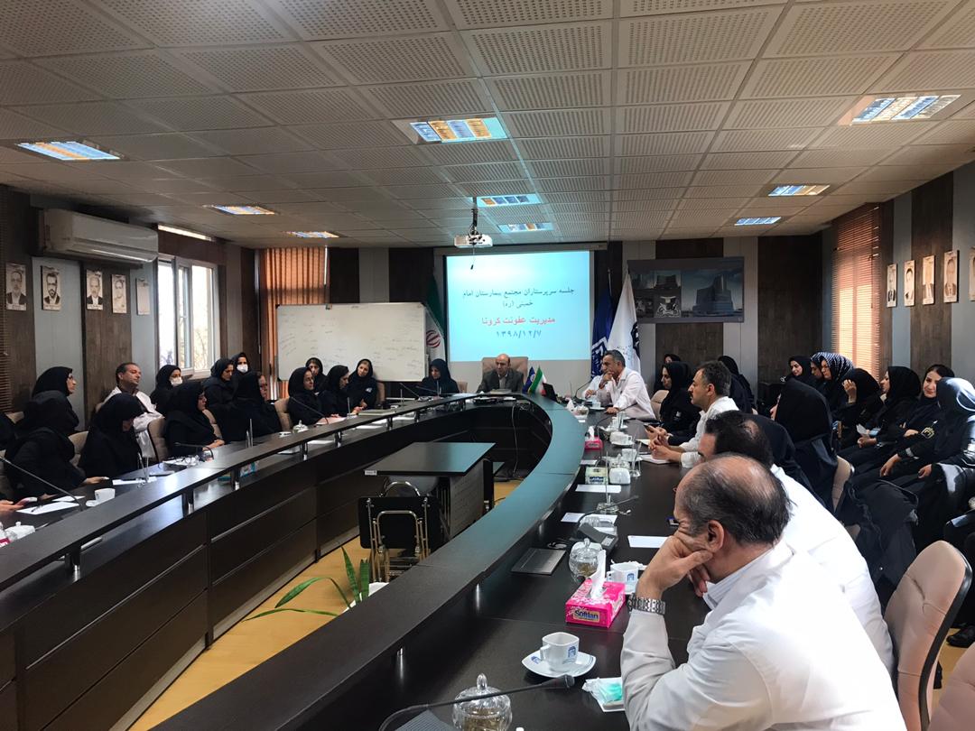 به دنبال سلسله جلسات متعدد معاونت‌ها و حوزه‌های مختلف درمانی و غیر درمانی مجتمع بیمارستانی امام خمینی (ره) در راستای کنترل بیماری کرونا، سرپرستاران این مجتمع در سالن شورای ریاست گرد هم آمدند و نظرات و پرسش‌های خود را در جهت کنترل هرچه بهتر این بیماری مطرح کردند.