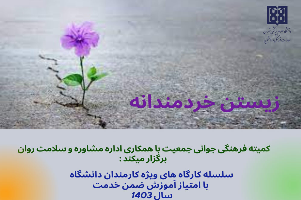 کمیته فرهنگی جوانی جمعیت معاونت فرهنگی و دانشجویی با همکاری اداره مشاوره و سلامت روان دانشگاه، سلسله کارگاه های توانمند سازی و رشد فردی را با عنوان "زیستن خردمندانه"همراه با امتیاز ضمن خدمت ویژه کارکنان دانشگاه علوم پزشکی تهران برگزار می کند.