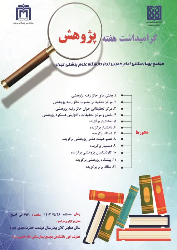 به همت معاونت امور دانشگاهی مجتمع و به مناسبت گرامیداشت هفته پژوهش جشنواره سالانه پژوهشی در دانشگاه علوم پزشکی تهران برگزار میشود.