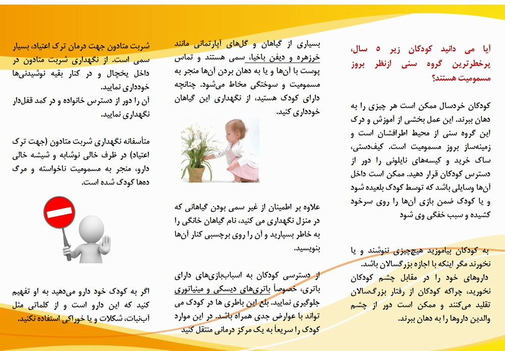 به گزارش روابط عمومی دانشگاه علوم پزشکی تهران معاونت غذا و دارو، مدیریت نظارت و پایش مصرف فراورده های سلامت در پیشبرد اهداف معاونت غذا و دارو در طی سفرهای نوروزی اقدام به تدوین پمفلت شامل توصیه هایی است که بتوانید از کودکانتان در مقابل مسمومیت محافظت کنید کرد. در این پمفلت آمده است: