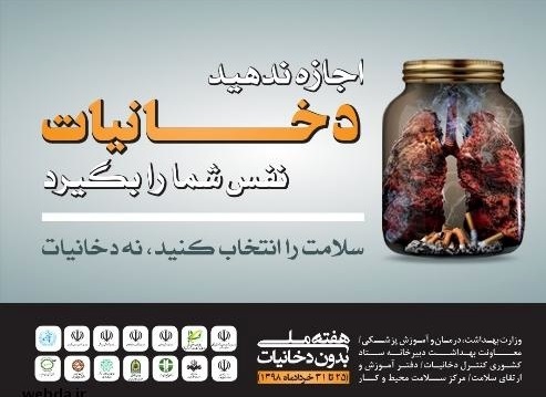 به مناسبت هفته ملی بدون دخانیات از 25 تا 31 خرداد ماه 98 و با شعار؛ اجازه ندهید دخانیات نفس شما را بگیرد، ضمن آموزش مطالبه گری شهروندی در این مقاله، باید از مسئولان شهرمان بخواهیم با نظارت بیشتر بر اماکن عمومی، مانع مصرف دخانیات در این اماکن شوند و زمینه های ارتقای سلامت عمومی را بیشتر فراهم کنند.