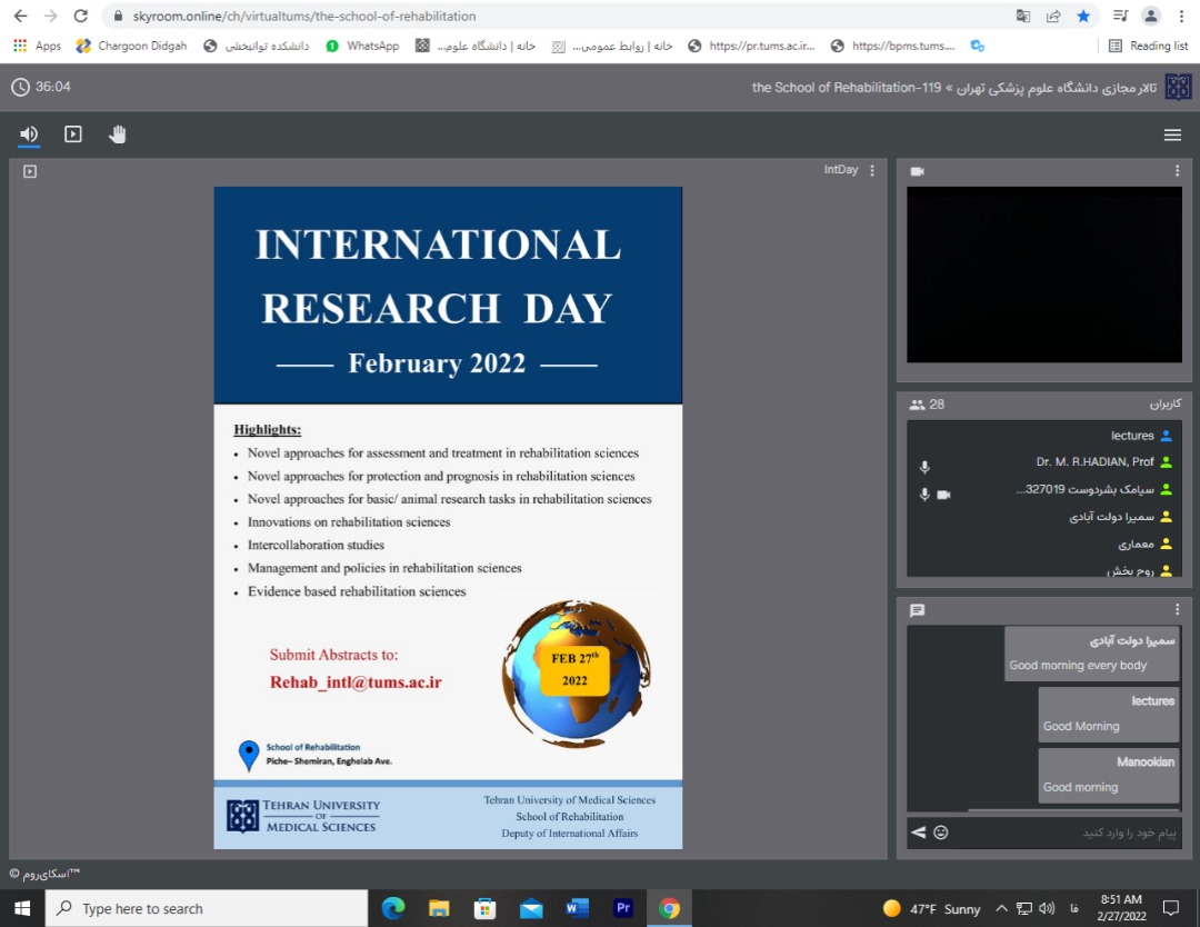 به گزارش روابط عمومی دانشگاه علوم پزشکی تهران دانشکده توانبخشی، به همت معاونت بین الملل دانشکده و با همکاری گروه های آموزشی، سومین جشنواره روز بینالمللی پژوهش دانشکده توانبخشی یکشنبه 8 اسفندماه 1400 به صورت مجازی و از طریق پلتفرم Skyroom با حضور اعضای هیئت علمی و دانشجویان تحصیلات تکمیلی برگزار شد.