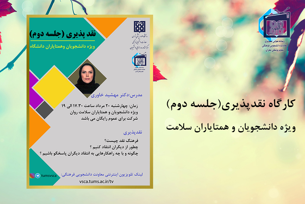مرکز مشاوره و راهنمایی معاونت دانشجویی فرهنگی دومین جلسه از کارگاه روانشناختی ویژه دانشجویان و همتایاران سلامت روان دانشگاه علوم پزشکی تهران را با عنوان «نقدپذیری 2» برگزار می کند.