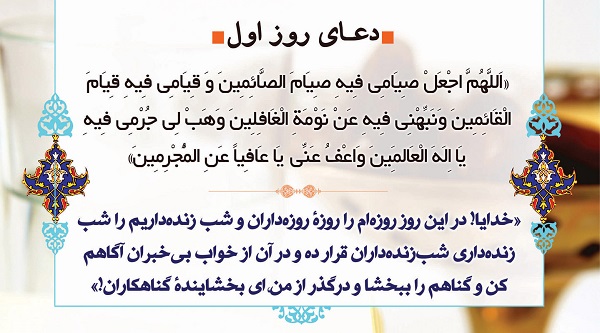 خدایا قرار بده روزه مرا در آن روزه داران واقعی وقیام وعبادتم در آن قیام شب زنده داران وبیدارم نما در آن از خواب بی خبران وببخش به من جنایتم را در این روز ای معبود جهانیان ودر گذر از من ای بخشنده جنایات کاران.