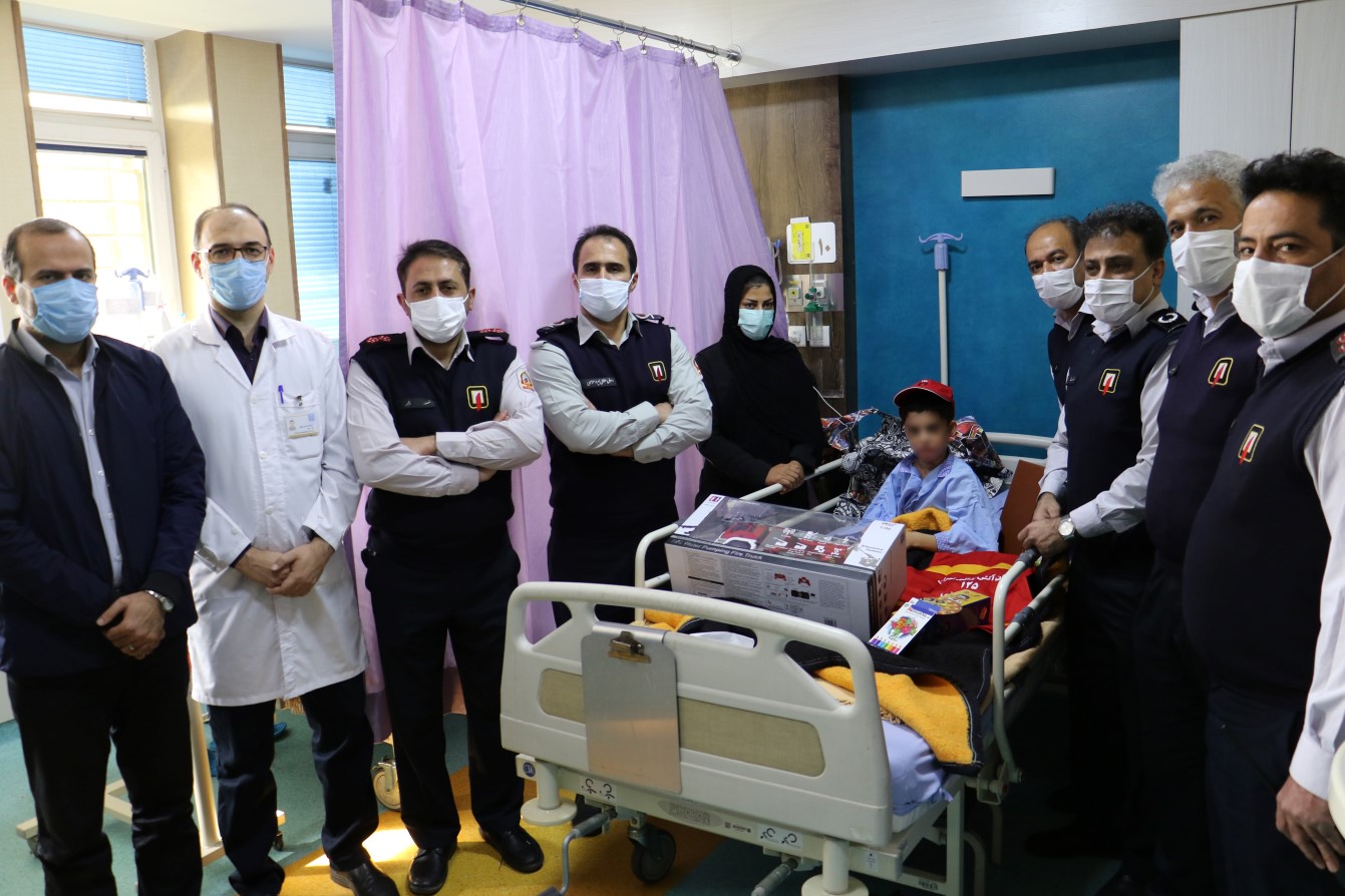 رضا وفایی معاون منطقه یک آتش نشانی و تیم همراه با حضور در مجتمع بیمارستانی امیراعلم با کودکی که دچار سانحه سوختگی شده بود دیدار کرد.