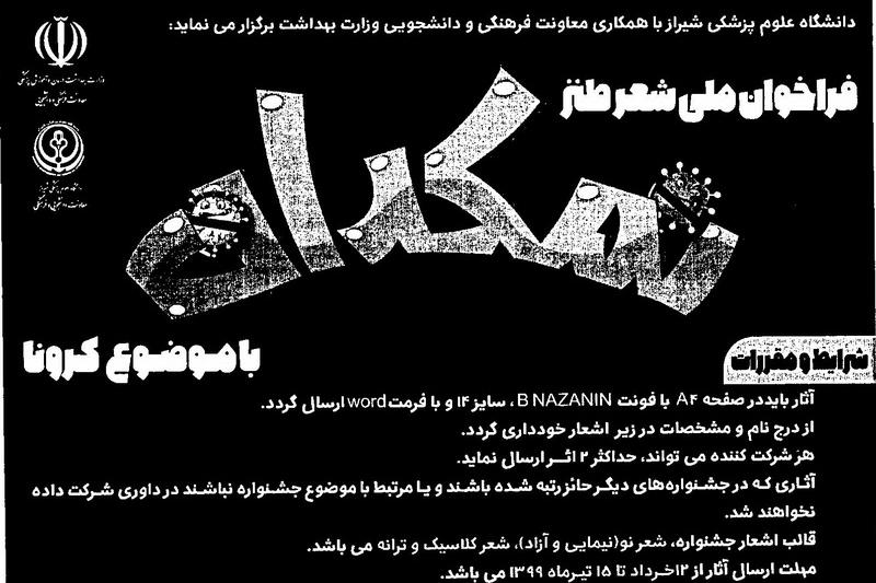 دانشگاه علوم پزشکی شیراز با همکاری معاونت فرهنگی و دانشجویی وزارت بهداشت، درمان و آموزش پزشکی، جشنواره ملی شعر طنز با موضوع «کرونا» را از 12 خرداد تا 15 تیر 99 برگزار می‌کند.
