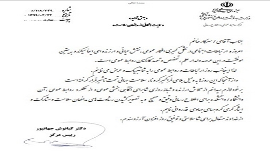 دکتر کیانوش جهانپور ریئس مرکز روابط عمومی و اطلاع رسانی وزارت بهداشت، درمان و آموزش پزشکی با توجه به روز ارتباطات و روابط عمومی برای روابط عمومی های دانشگاه های علوم پزشکی تقیر نامه ای ارسال کرد.