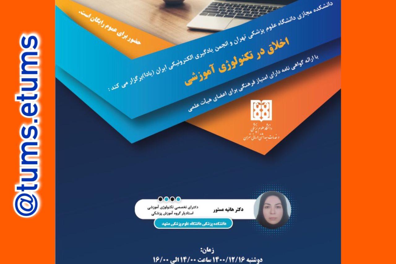 به گزارش روابط عمومی دانشگاه علوم پزشکی تهران دانشکده مجازی، این دانشکده با همکاری انجمن یادگیری الکترونیکی ایران (یادا) سخنرانی علمی اخلاق در فضای مجازی را در ادامه اهداف بیستمین همایش کشوری آموزش علوم پزشکی با عنوان « اخلاق در تکنولوژی آموزشی» را ویژه اعضای هیأت علمی دانشگاههای علوم پزشکی سراسر کشور بصورت رایگان و با گواهی نامه دارای امتیاز فرهنگی برگزار می کند.