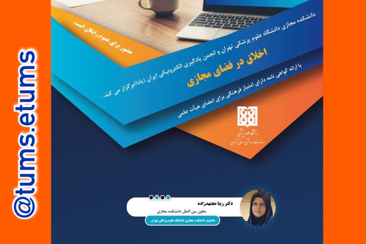 به گزارش روابط عمومی دانشگاه علوم پزشکی تهران دانشکده مجازی، این دانشکده با همکاری انجمن یادگیری الکترونیکی ایران (یادا) سخنرانی علمی اخلاق در فضای مجازی را در ادامه اهداف بیستمین همایش کشوری آموزش علوم پزشکی با عنوان «اخلاق در فضای مجازی» را ویژه اعضای هیأت علمی دانشگاههای علوم پزشکی سراسر کشور بصورت رایگان و با گواهی نامه دارای امتیاز فرهنگی برگزار می کند.