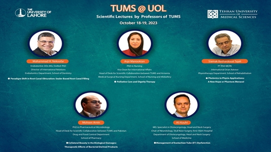 دکتر امین با موضوع "Therapeutic Effects of Bacterial Derived Products"، دکتر نکوفر با موضوع "Paradigm Shift in Root Canal Obturation: Sealer Based Root Canal Filiing"، دکتر مانوکیان با موضوع "Palliative Care and Dignity Therapy"، دکتر کوهی با موضوع "Management of ET Dysfunction" و دکتر بشردوست با موضوع "Photonics in Physio Applications; A New Hope or Phantom Menace" برای اساتید و دانشجویان دانشگاه لاهور سخنرانی کردند و در پایان سخنرانی نیز به سؤالات اساتید و دانشجویان پاسخ دادند.