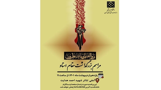 به گزارش روابط عمومی دانشگاه علوم پزشکی تهران دانشکده دندانپزشکی، مراسم بزرگداشت مقام استاد یکشنبه یازدهم اردیبهشت ماه 1401 در آمفی تاتر شهید احمد هدایت دانشکده دندانپزشکی برگزار می شود.