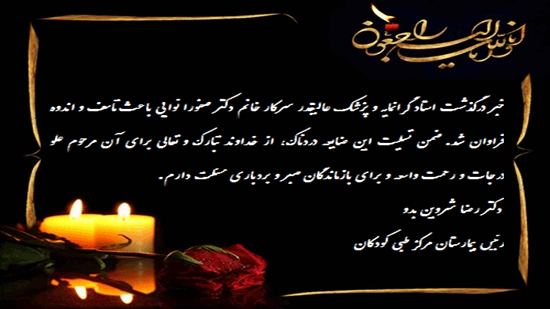 دکتر رضا شروین بدو رئیس بیمارستان در پیامی درگذشت سرکار خانم دکتر صفورا نوایی را تسلیت گفت.