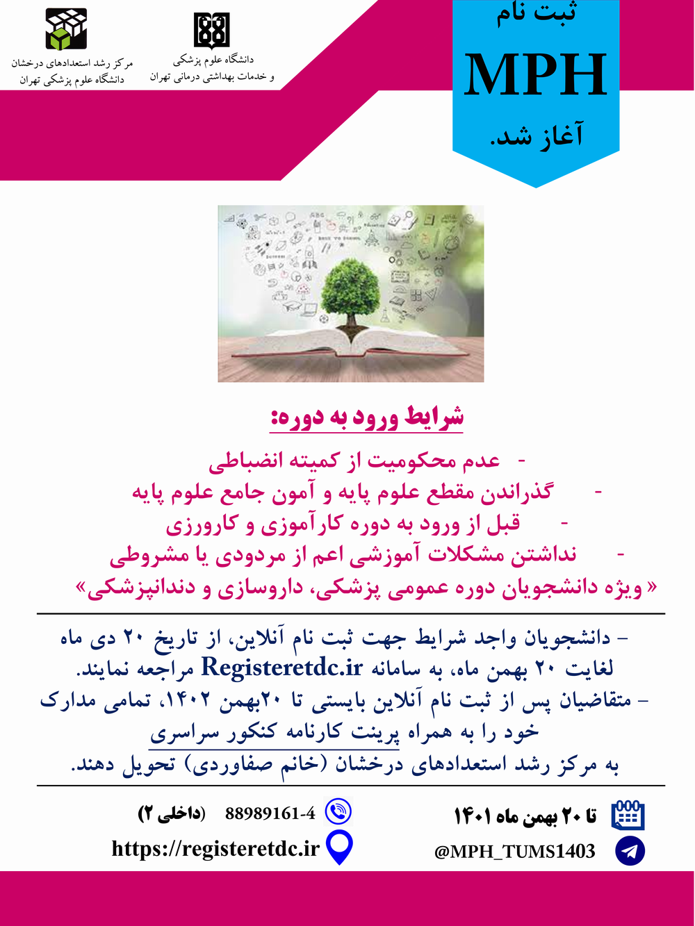 به گزارش سینا رسانه دانشگاه علوم پزشکی تهران مرکز رشد استعدادهای درخشان، متقاضیان واجد شرایط ثبت نام در دوره تحصیل همزمان MD/DDS/Pharm-MPH از 20 دی ماه تا 20 بهمن 1402 مهلت دارند، پس از ثبت نام بر روی سامانه  Registeretdc.ir، مدارک خود را به صورت فیزیکی به کارشناس مربوطه در مرکز رشد استعدادهای درخشان دانشگاه علوم پزشکی تهران ( سپیده صفاوردی ) ارائه کنند.