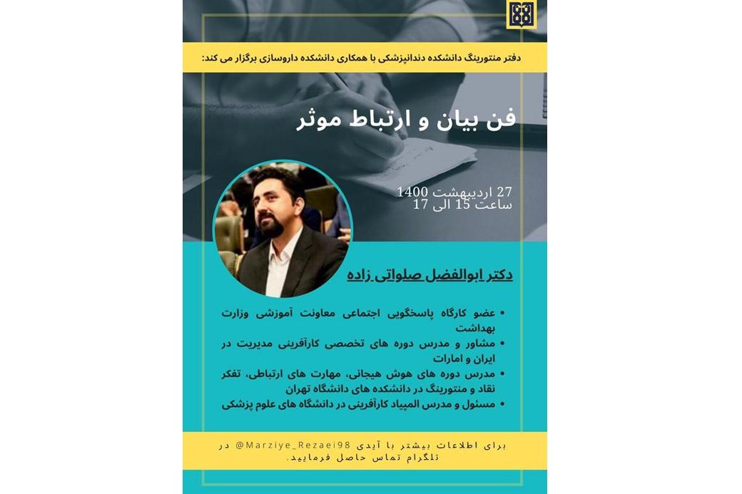 به گزارش روابط عمومی دانشگاه علوم پزشکی تهران دانشکده دندانپزشکی، دفتر منتورینگ دانشکده دندانپزشکی با همکاری دانشکده داروسازی وبینار فن بیان و ارتباط موثر را  با سخنرانی دکتر ابوالفضل صلواتی زاده  27 اردیبهشت ماه 1400 ساعت 15 تا 17 برگزار میکند.