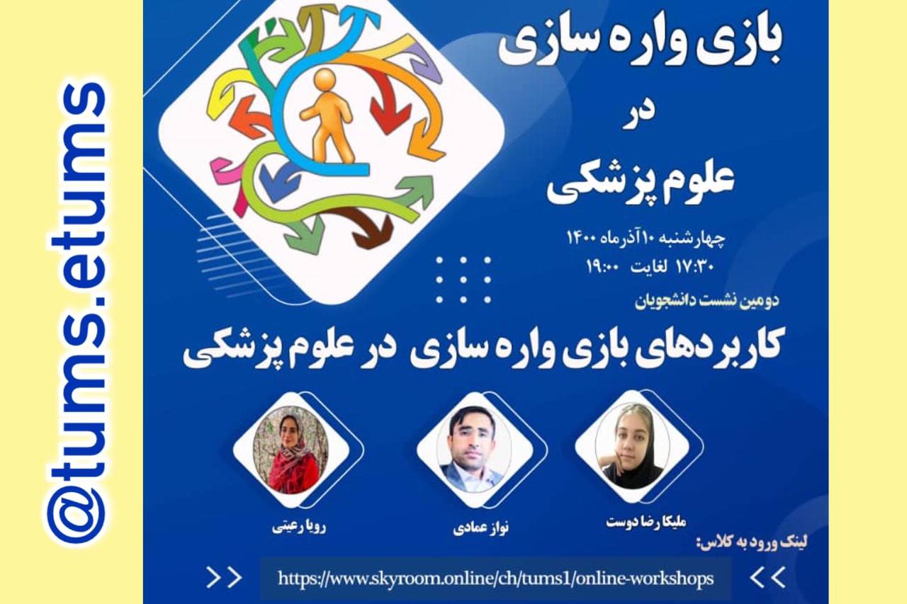 این نشست با حضور ملیکا رضا دوست، نواز عمادی و رویا رعیتی روز چهارشنبه 10 آذر 1400 از ساعت 17:30 تا 19 برگزار می شود و به موضوعات کاربرد بازی واره سازی در علوم پزشکی می پردازد.