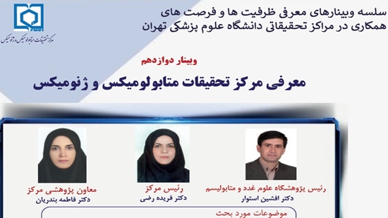 دوازدهمین وبینار از سلسله وبینارهای معرفی ظرفیتها و فرصتهای همکاری در مراکز تحقیقاتی دانشگاه علوم پزشکی تهران با محوریت معرفی مرکز تحقیقات متابولومیکس و ژنومیکس برگزار خواهد شد.