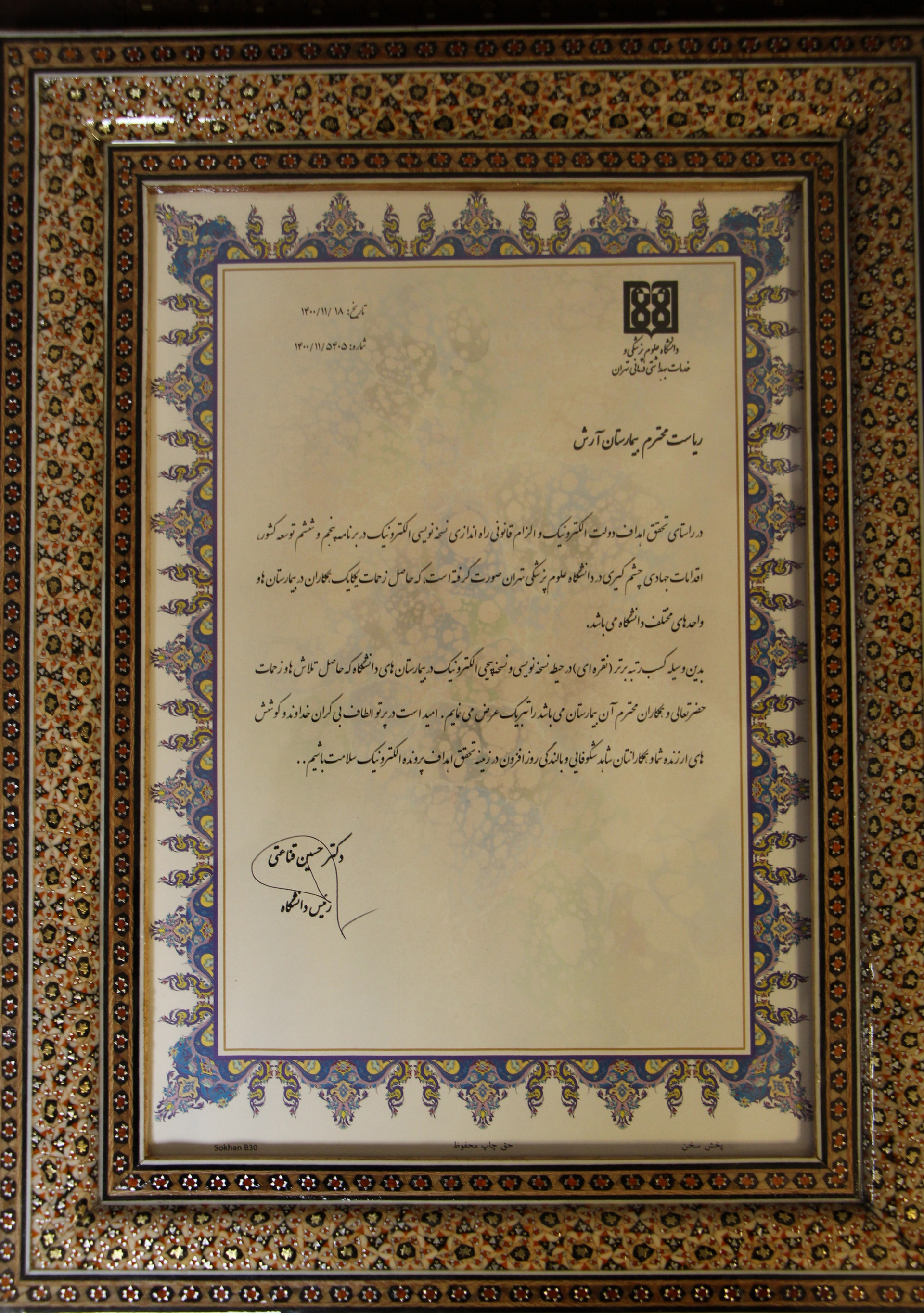 دکتر حسین قناعتی، رئیس دانشگاه در لوح تقدیری از زحمات بیمارستان آرش در جهت پیشبرد نسخه نویسی و نسخه پیچی الکترونیک قدردانی کرد. لوح تقدیر به دکتر افسانه تهرانیان، رئیس بیمارستان تقدیم شد.بیمارستان آرش در رتبه بندی کلی بیمارستان رتبه سوم را به خود اختصاص داد.