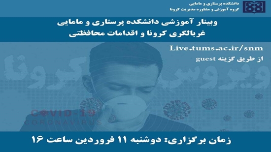 وبینار آموزشی دانشکده پرستاری و مامایی در زمینه غربالگری کرونا و اقدامات محافظتی 11 فروردین ساعت ۱۶ برگزار می شود.