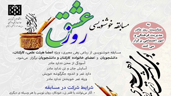 مدیریت امور فرهنگی و اجتماعی، به مناسبت میلاد مبارک حضرت فاطمه زهرا (س) و روز مادر مسابقه خوشنوسی را با عنوان روز عشق در دانشگاه علوم پزشکی تهران برگزار می کند.