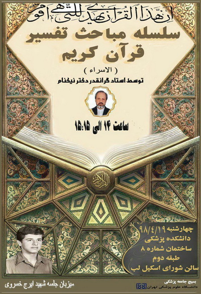 به همت بسیج جامعه پزشکی دانشکده پزشکی و توسط دکتر نیکنام جلسه تفسیر قرآن کریم با محوریت سوره اسرا برگزار شد.
