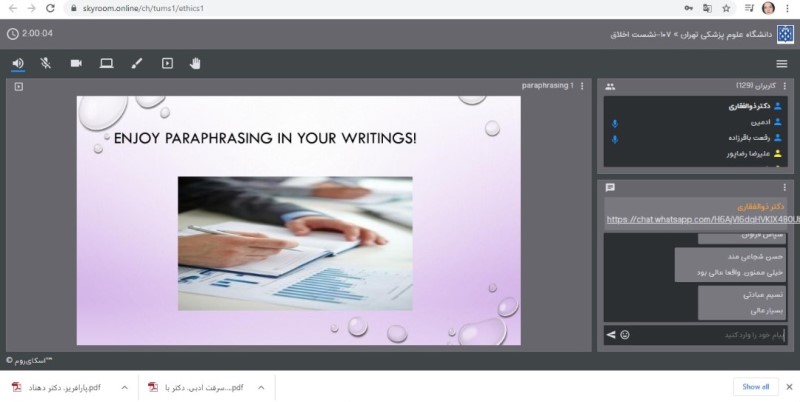 در این نشست مجازی که با حضور بیش از 130 تن از مخاطبان علاقه مند به این حوزه از سراسر کشور برگزار شد، دکتر افسانه دهناد و دکتر رفعت باقرزاده دکتری آموزش زبان انگلیسی از دانشگاه علوم پزشکی ایران به موضوعات سرقت ادبی و راه کارهای جلوگیری از آن پرداختند که در بخش اول این کارگاه دکتر باقرزاده به مصادیق سرقت ادبی، انواع آن و راههای اجتناب از سرقت ادبی و معرفی چند نمونه از نرم افزارهای تشخیص سرقت ادبی اشاره کرد و در بخش دوم دکتر دهناد در خصوص خلاصه نویسی، paraphrase و نحوه استفاده صحیح از این رویکرد در نگارش متون علمی به تفضیل و با ذکر مثالهای کاربردی مطالبی را عنوان نمود.