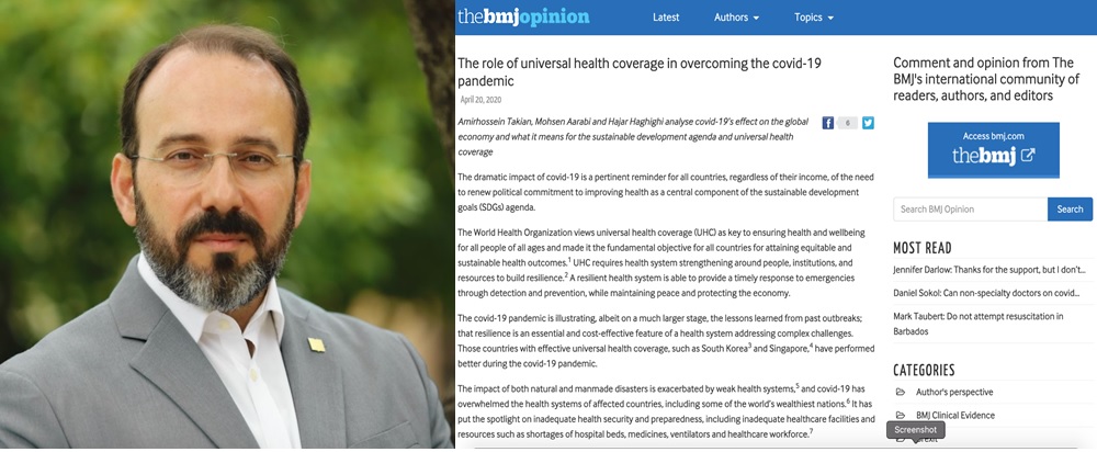 به گزارش روابط عمومی دانشکده بهداشت، دکتر امیرحسین تکیان معاون بین الملل دانشکده، مدیر گروه سلامت جهانی و دانشیار گروه علوم مدیریت و اقتصاد سلامت دانشکده بهداشت با همکاری دکتر محسن اعرابی و هاجر حقیقی مقاله ای با عنوان لزوم توجه به مراقبت های اولیه بهداشتی و پوشش همگانی سلامت در جهان گیری کووید ۱۹ در مواجهه با آن چه مولفین کووی فلو نامیده اند، یعنی ترکیب آنفولانزای فصلی و کووید-۱۹ در British Medical Journal (BMJ) از معتبرترین نشریات پزشکی جهان ارائه کردند.