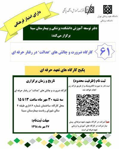 کارگاه «ضرورت و چالشهای عدالت در رفتار حرفهای» روز سه شنبه 30 مهر 98 برگزار می شود