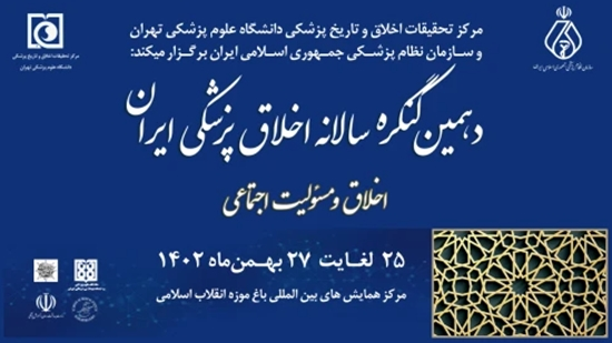 به گزارش روابط عمومی دانشگاه علوم پزشکی تهران مرکز تحقیقات اخلاق و تاریخ پزشکی، دهمین کنگره سالانه اخلاق پزشکی ایران با شعار «اخلاق و مسئولیت اجتماعی»، و با محورهای اصلی «اخلاق در آموزش»، «اخلاق در ارائه خدمات سلامت»، «اخلاق در پژوهش» و «اخلاق در فناوریهای نوین» به میزبانی مرکز تحقیقات اخلاق و تاریخ پزشکی و سازمان نظام پزشکی جمهوری اسلامی ایران و با همکاری فرهنگستان علوم پزشکی، معاونت پرستاری وزارت بهداشت و بنیاد حکمت تاریخ و اخلاق پزشکی، از 25 تا 27 بهمن 1402 ساعت 8 تا 17:15 به صورت حضوری در مرکز همایشهای بینالمللی باغ موزه انقلاب اسلامی دفاع مقدس برگزار میشود.