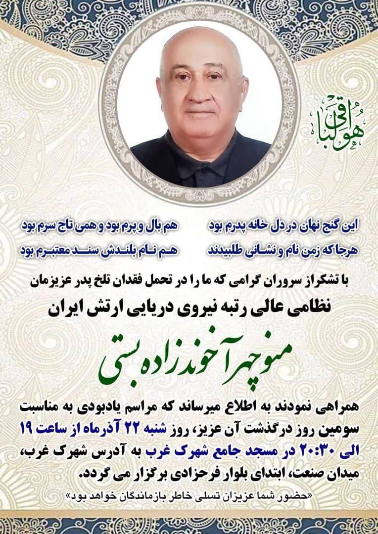 اطلاعیه مراسم ترحیم منوچهر آخوندزاده بستی، نظامی عالی رتبه نیروی دریایی ارتش؛ پدر دکتر شاهین آخوندزاده