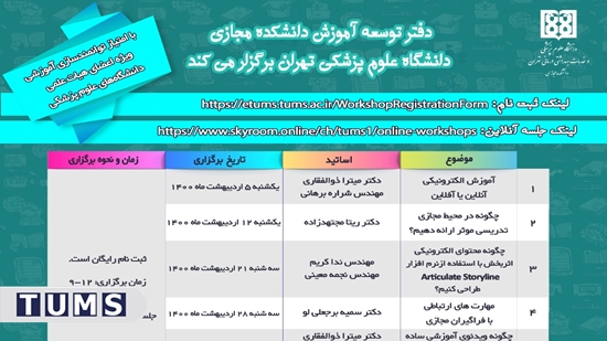 ـ چگونه ویدئوی آموزشی ساده برای آموزش پزشکی طراحی و تدوین کنیم؟ با ارائه دکتر میترا ذوالفقاری، مهندس شراره برهانی و مریم شهامت نیا، سهشنبه 4 خرداد 1400