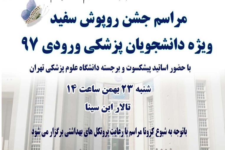 با حضور دکتر قناعتی رئیس دانشگاه علوم پزشکی تهران، روز شنبه ۲۳ بهمن مراسم جشن روپوش سفید دانشجویان پزشکی ورودی ۹۷ برگزار می شود.