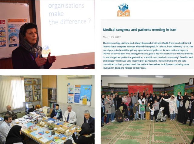 به گزارش روابط عمومی مرکز تحقیقات ایمونولوژی، آسم و آلرژی، مارتین پرژان نایب رئیس سازمان بین المللی حمایت از بیماریهای نقص ایمنی اولیه (IPOPI) که به نمایندگی از این سازمان در روزهای 27 تا 29 بهمن سال 95، در سومین همایش بین المللی ایمونولوژی، آسم و آلرژی، شرکت داشت، گزارشی از برنامه حضور خود در این کنگره و کارگاه های جنبی آن و همچنین بازدید از مرکز تحقیقات ایمونولوژی، آسم و آلرژی و سایر مراکز آموزشی و درمانی ایران در خصوص بیماران نقص ایمنی اولیه در سایت بین المللی بیماریهای نقص ایمنی ارائه کرده است. ترجمه متن گزارش ایشان به شرح ذیل است.