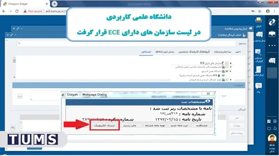 بدین منظور همکاران بعد از آماده سازی متن نامه استعلام مورد نظر، انتخاب امضا کننده نامه در برگه اطلاعات نهایی، به قسمت گیرنده نهایی نامه مراجعه کرده و در برگه اشخاص از ساختار درختی سازمان های دارای ECE، گزینه دانشگاه علمی کاربردی را انتخاب نموده و کلید ثبت را بزنند سپس گزینه ارسال الکترونیک را مشاهده نموده که جهت ارسال نهایی نامه باید انتخاب شود.