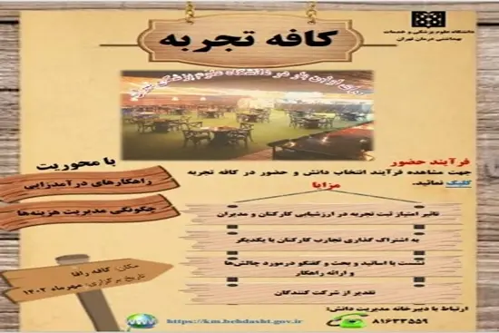 دبیرخانه مدیریت دانش دانشگاه علوم پزشکی تهران در نظر دارد نخستین کافه تجربه خود را با موضوع «راهکارهای درآمدزایی و چگونگی مدیریت هزینه‌ها» را برگزار کند.
