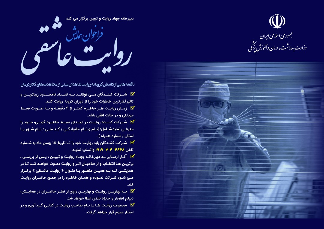دبیرخانه جهاد روایت و تبیین در اقامه و اجرای منویات رهبر، به‌منظور ثبت و مستندسازی وقایع کرونا و جلوگیری از تحریف آنچه در این دوران بر کادر درمان و نظام سلامت گذشته همایش روایت عاشقی را برگزار می‌کند.